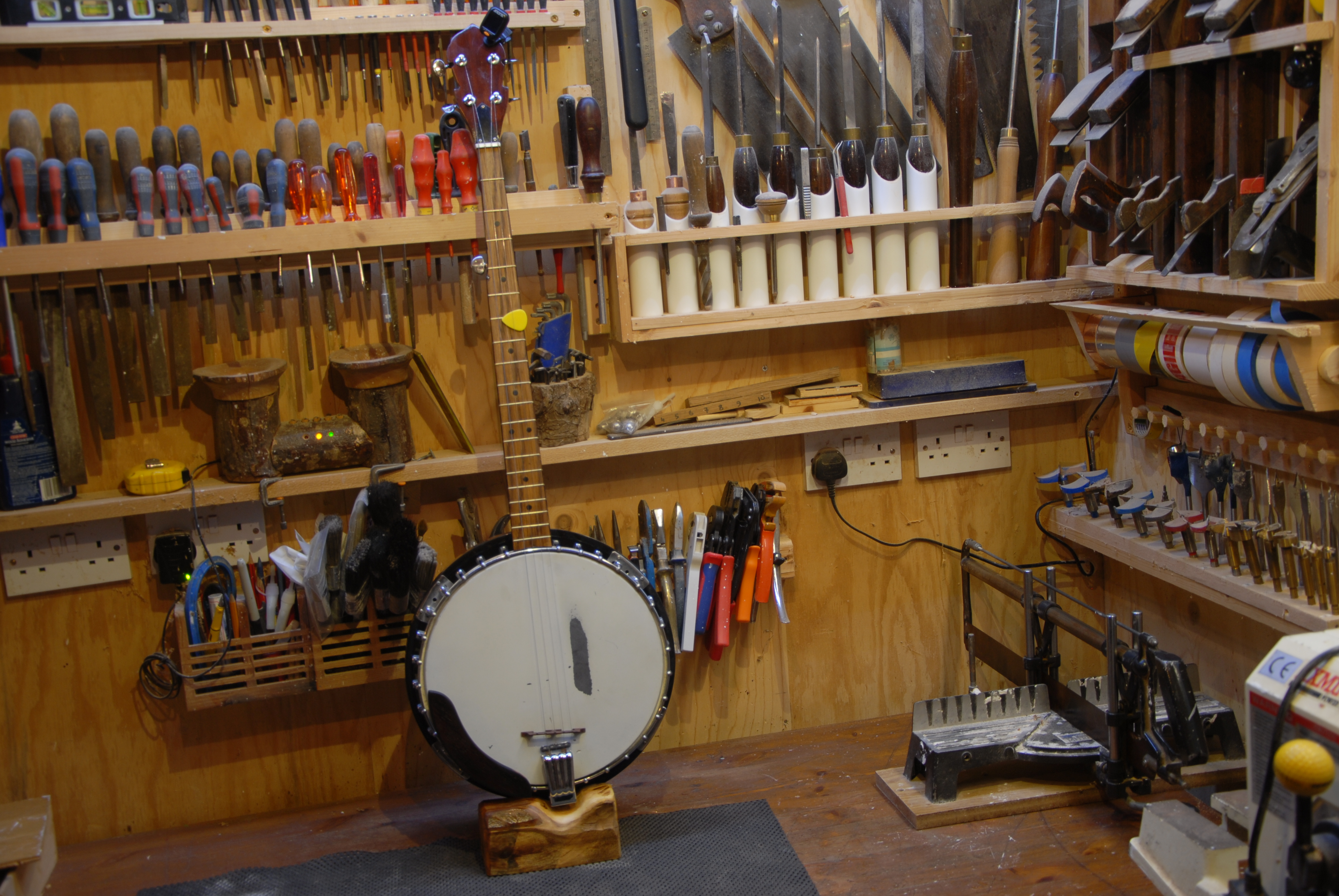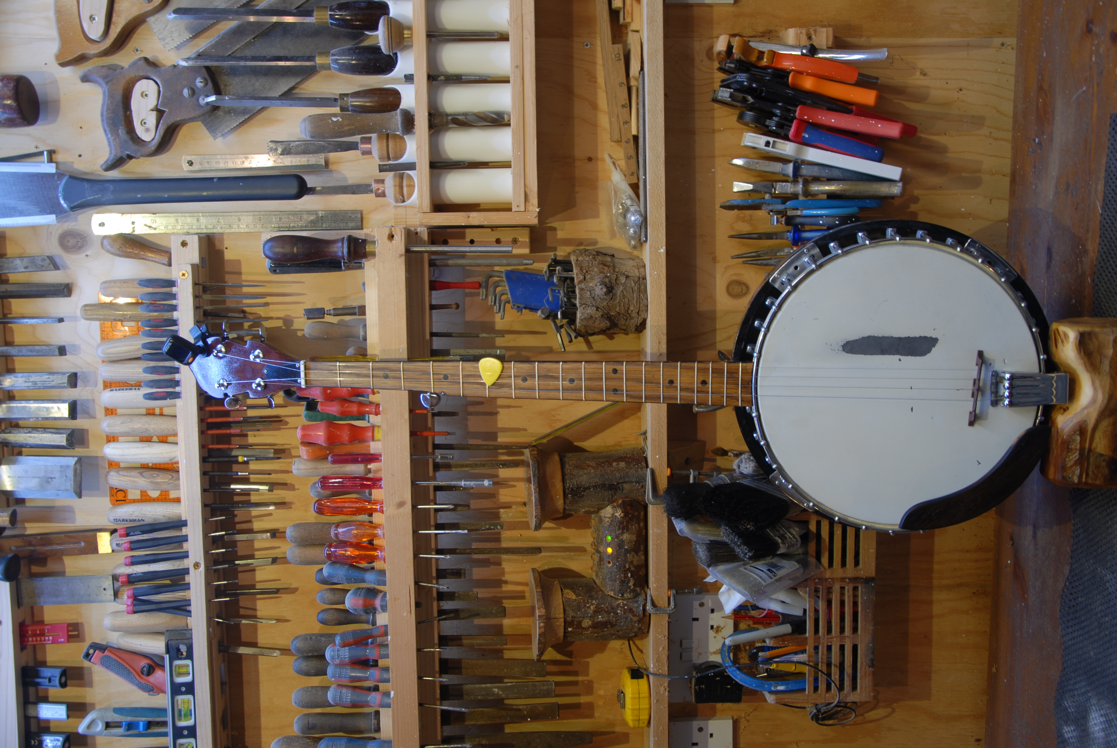 The banjo got a new fretboard and was re-fretted after the previous owner used the old rail-road-spike trick to change the tuning of the fifth string quickly. It also needed some work on the intonation.